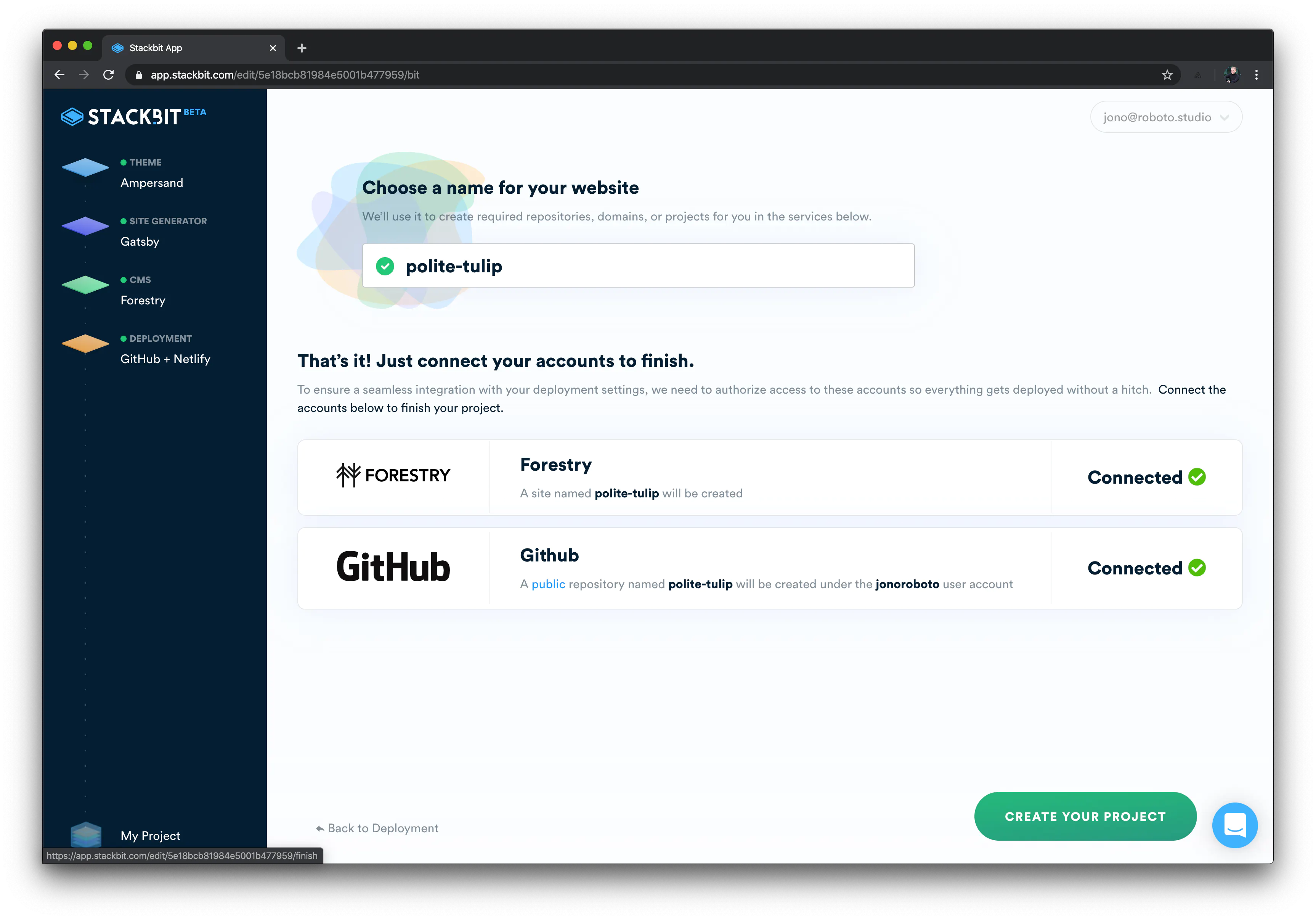 This is where the magic happens, Stackbit will commit a Gatsby website to your GitHub account, it will spin up an instance of Netlify and tie all of it together (rather miraculously) and setup everything to get you started with a www.yourwebsite.netlify.com domain.