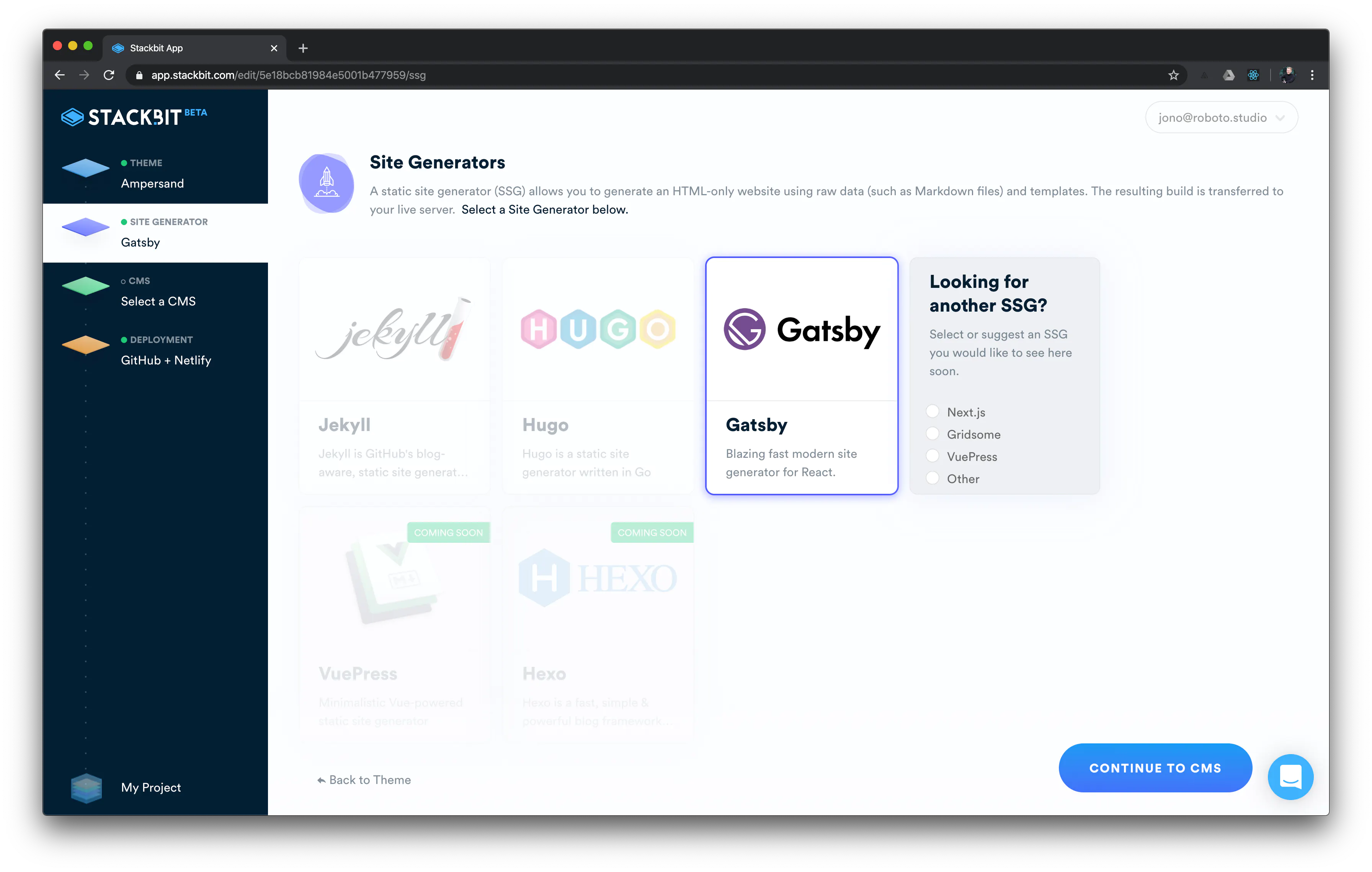 Now for the much more fun, and fancy part. We're going to start by signing up for Stackbit. This is a tool that brings together our: