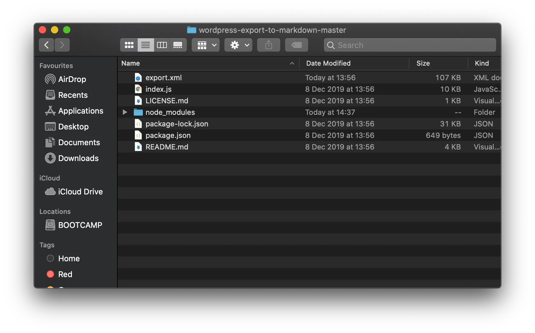 Once installed to keep things simple we are going to rename the export from WordPress to "export.xml". We're then going to drag it into the root of the wordpress-export-to-markdown-master folder which we downloaded and extracted earlier.