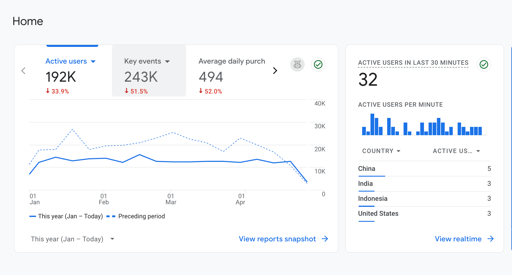 Imagine you own a business, the previous quarter of the year, the business was booming. Plenty of traffic on the website, a large number of key events being clicked, signifying the active user interaction with the website, and lots of sales because of the purchases being made. This year, the website is not doing great. There is a decline in the number of active users, as well as a decrease in interaction with the website and the number of purchases being made. This is what the data in the above picture indicates.