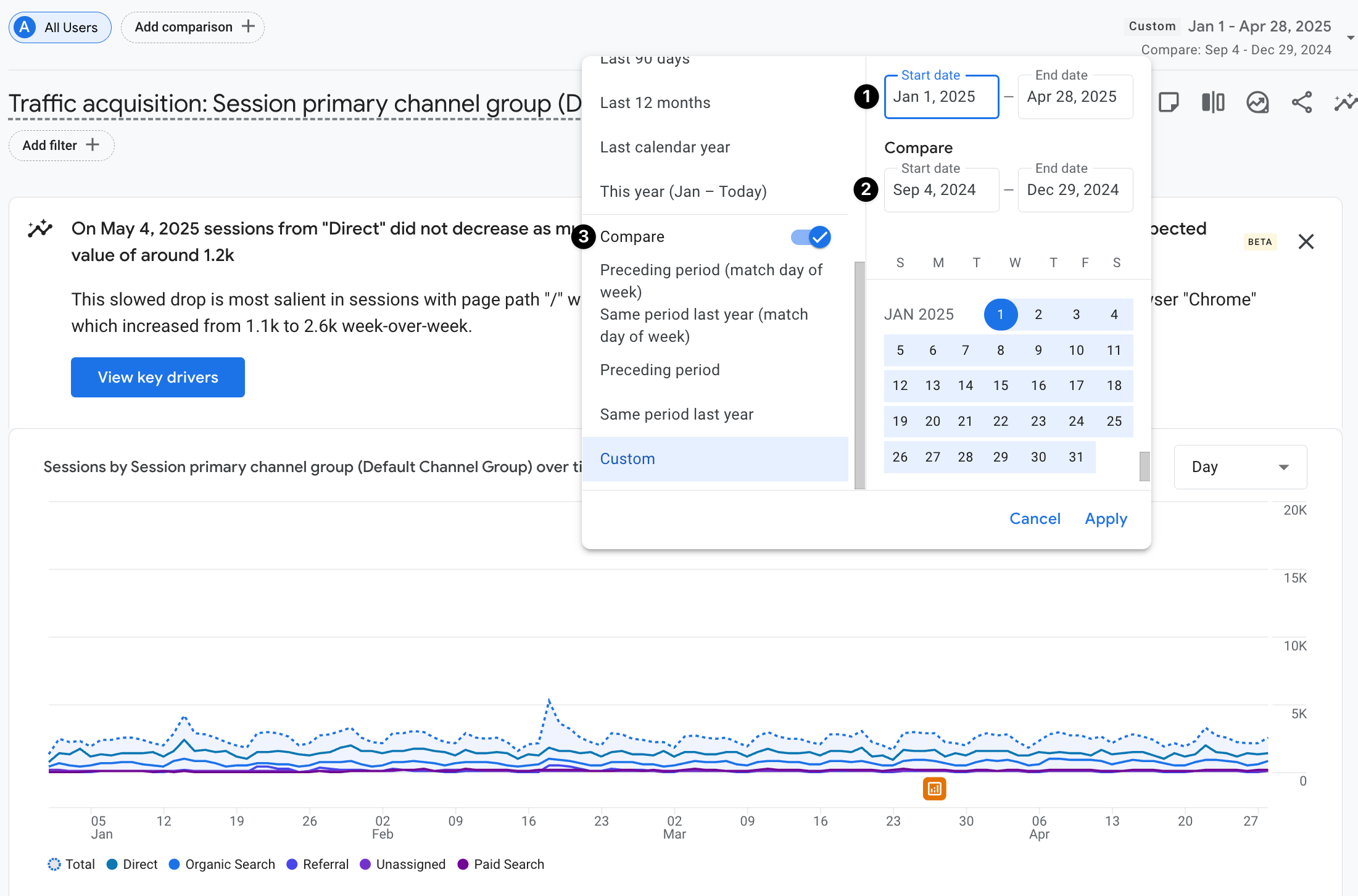 Notice how we set our comparison dates (1) and (2) after enabling the compare option(3). After successfully setting the date range, you will have an interface just like the visuals below