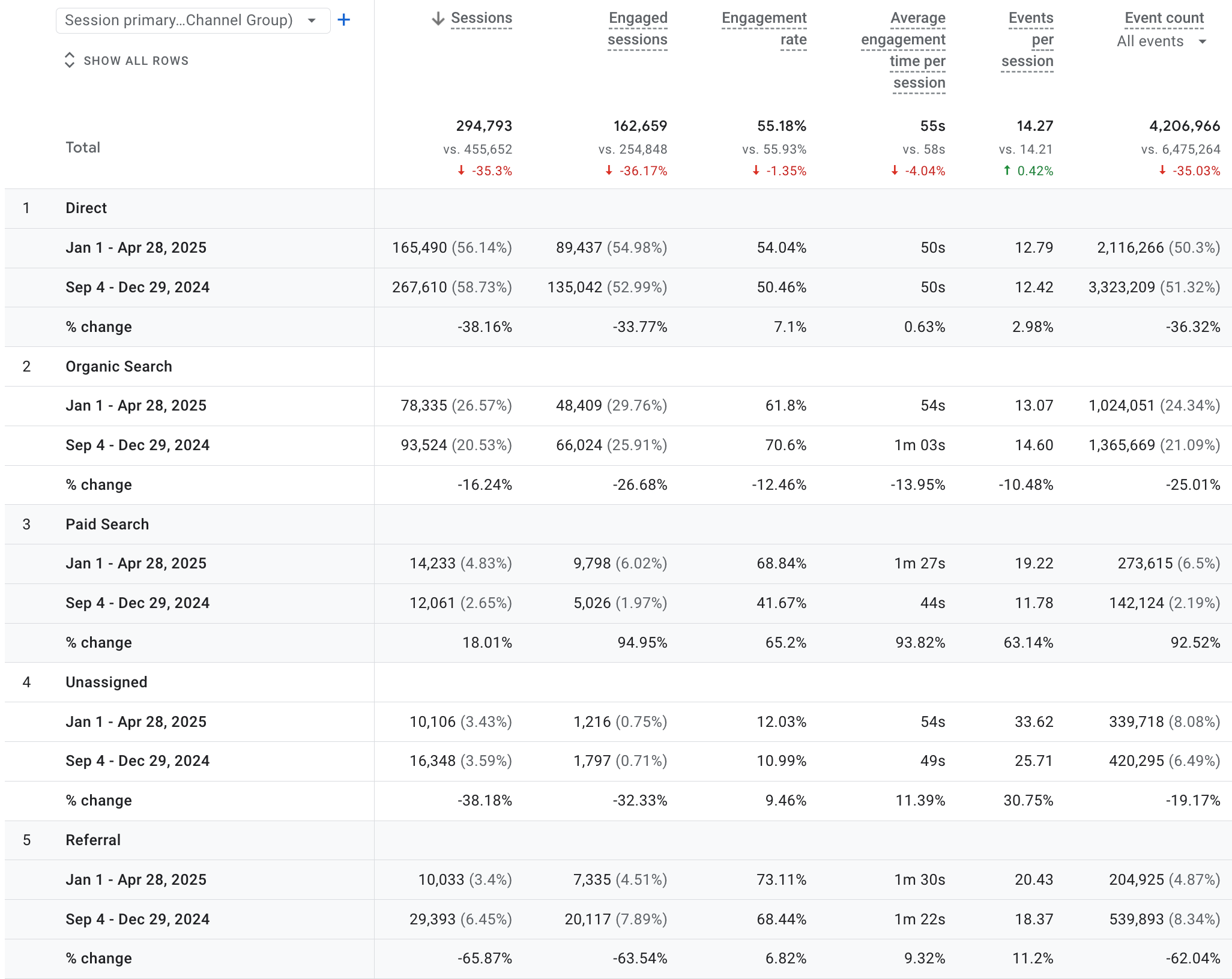 Starting with the direct traffic, the dip of -37.99% may have several reasons, including technical ones. However, being skeptical that the dip is due to the marketing campaigns, we will assume that this dip is caused by a change in the marketing strategy or disruption of the brand awareness campaign.