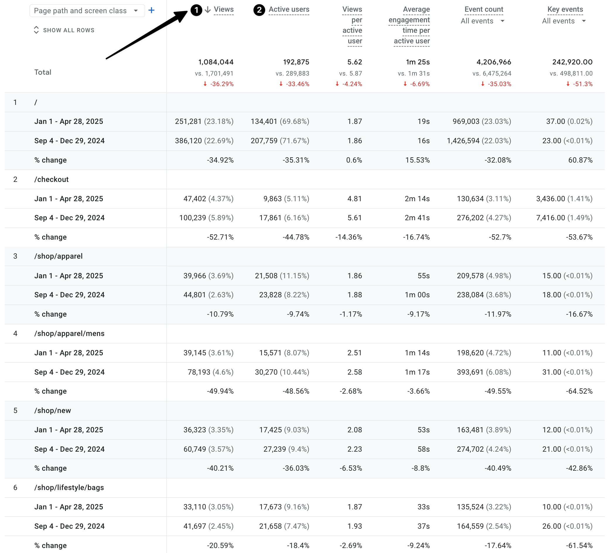 Notice the change in percentages. The percentage decrease in views varies from page to page. Since there is a reduction in website traffic, it is expected to see negative percentage changes. But the real concern is which pages are experiencing a significant loss in views. You can observe the following information in the Active users column.